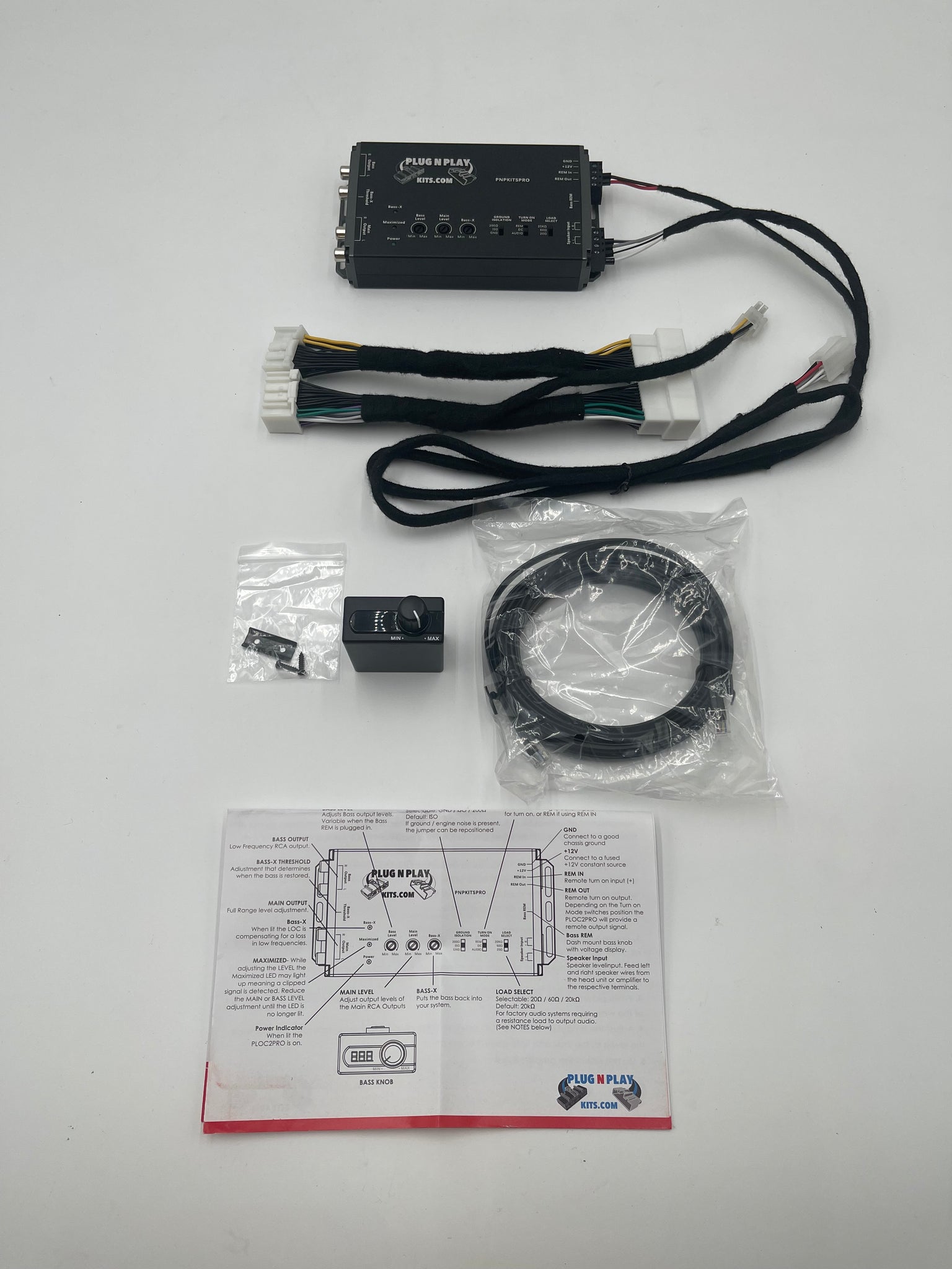 KIT 3 PLUGNPLAYKITS PNPKITSPRO PREMIUM ACTIVE 2 CHANNEL LOC WITH 17 FT HARNESS WITH BUILT IN LOAD RESISTORS & BASS BOOST AND COMPENSATION TECHNOLOGY . BASS X RESTORES BASS ROLL OFF, GROUND ISOLATION & CLIP LIGHT & BASS KNOB WITH VOLT METER $ 190